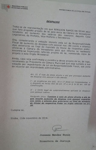 O Ministério Público do Estado da Bahia, representado pela Promotora de Justiça de Itiúba, Joseane Mendes Nunes, emitiu despacho referente a representação do cidadão Renilson Ramos um dos organizadores do movimento Vem pra Câmara.