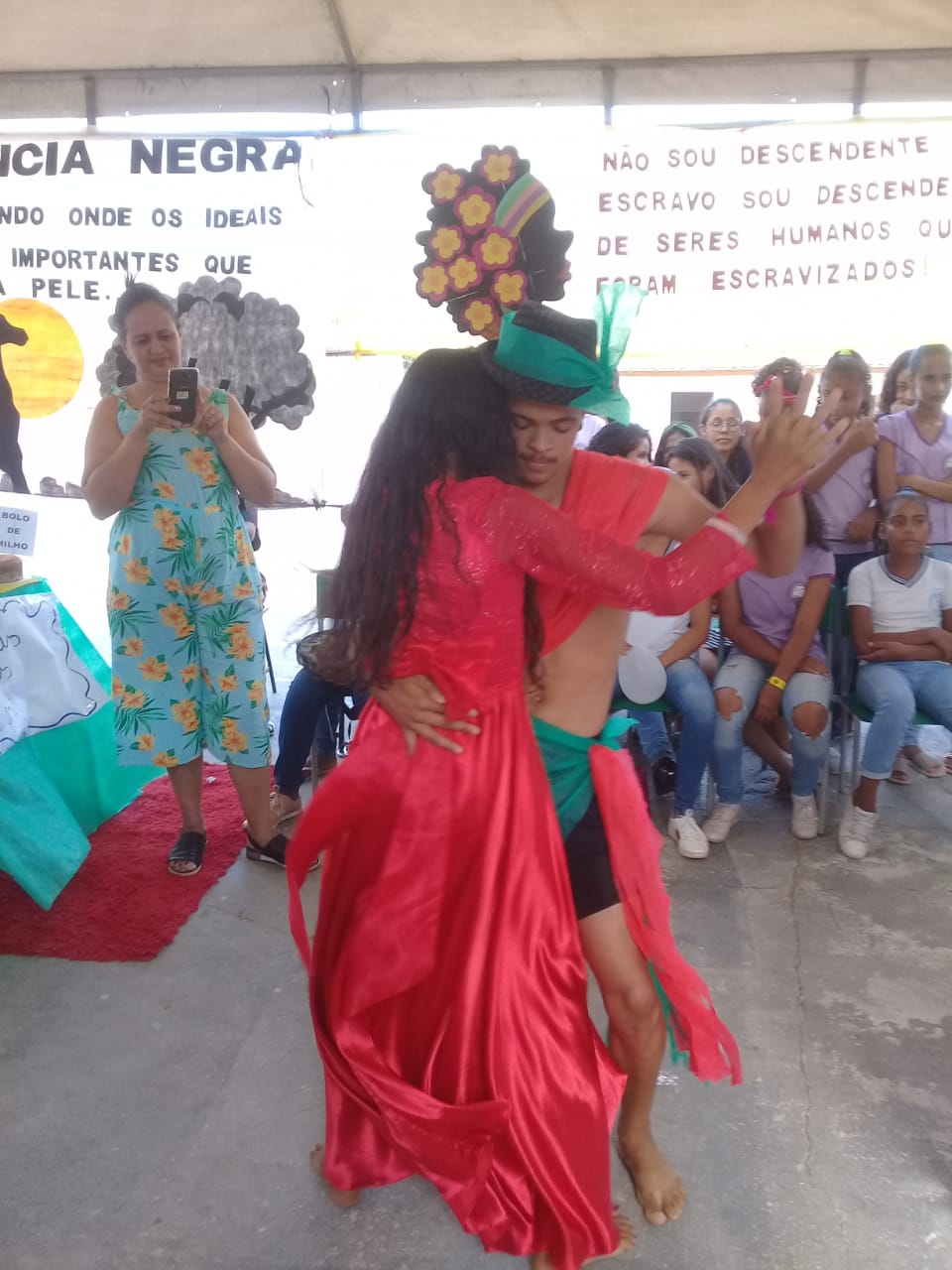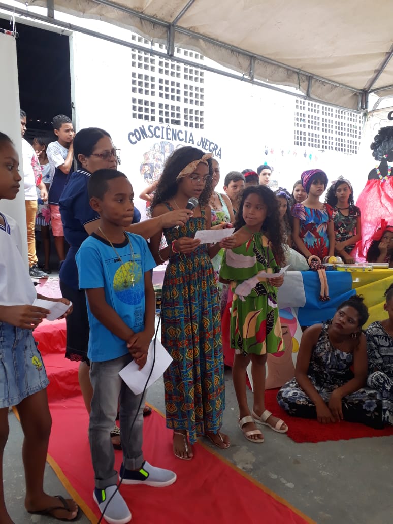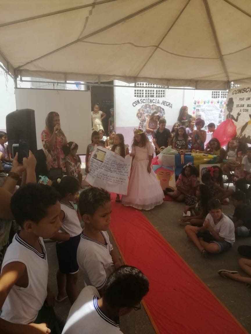 O evento também contou com a participação do escritor Toni de Souza que, à distância, falou um pouco do seu livro “Quem é esse nego!?”, teceu reflexões sobre identidade, pertencimento e agradeceu pelo trabalho que a professora Joelma e os alunos do 6º ano realizaram a partir do seu livro. Um bonito momento foi a apresentação dos alunos do 5º ano que, orientados pela coordenadora Jaciane, cantaram “Banzo Maracatu” e foram fortemente aplaudidos. Também teve uma bela apresentação de capoeira feita pelos nossos alunos e conduzida pelo professor Paulo. Para finalizar a manhã, os alunos participaram de um maravilhoso desfile, exaltando a beleza negra. As apresentações referentes à consciência negra se estenderam pelo vespertino e também pelo noturno, uma experiência gratificante para todos os envolvidos.