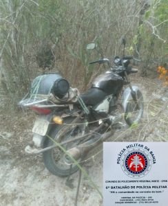 RESUMO: A vítima relata que ia para sua roça tirar leite conduzindo sua moto com um vasilhame de leite, quando dois indivíduos encapuzados abordaram o mesmo com armas de fogo em punho tipo 12 bengala de moto, mandaram a vítima descer em seguida montaram na motocicleta, uma Honda/CG150, placa JOX4763, cor preta tomando destino ignorado, em diligência Vtr 80610 localizou dentro da caatinga a motocicleta abandonada, que foi entregue ao proprietário.