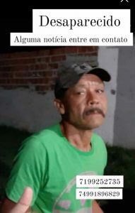 Quem tiver notícias de Reinaldo favor entrar em contato nos números (71) 99925-2735, (74) 99189-6829