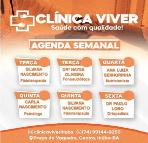 A Clínica Viver em Itiúba, divulgou sua agenda fixa de atendimentos especializados em Fisioterapia, Fonoaudiologia, Nutricionista, Psicólogo e Ortopedista. Os atendimentos vão de terça a sexta – feira.