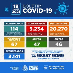 A Prefeitura de Senhor do Bonfim divulgou na noite desta quinta – feira, 18 de março de 2021, o Boletim Epidemiológico que confirmou mais 1 óbito por COVID-19.
