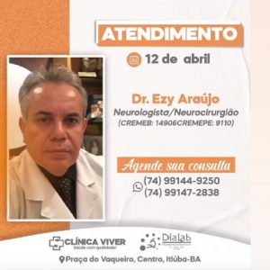 O Dr Ezy Araújo, Neurologista e Neurocirurgião estará atendendo na Clínica Viver em Itiúba, nesta segunda – feira, 12 de março de 2021.