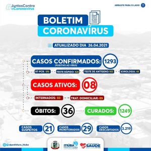 A Prefeitura de Itiúba, divulgou na noite desta segunda – feira, 26 de abril de 2021, mais um boletim epidemiológico do município.