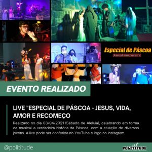 O grupo POLITITUDE de Senhor do Bonfim realizou a peça do especial de páscoa: Jesus, vida, amor e recomeço; a representação do sacrifício de Cristo por amor à humanidade.