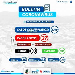 A Prefeitura de Itiúba, divulgou na noite deste domingo, 04 de abril de 2021, mais um boletim epidemiológico do município.
