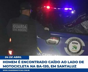 Um homem de 54 anos foi socorrido pela Guarda Civil Municipal (GCM) de Santaluz depois de ser encontrado caído ao lado de uma motocicleta, na noite deste sábado (3). O acidente, cuja circunstância é desconhecida, aconteceu nas imediações de uma fábrica de calçados, na BA-120, saída para o município de Queimadas. Segundo a GCM, o homem, identificado como Antônio Raimundo, residente no bairro Morro dos Lopes, foi encaminhado ao hospital local, com escoriações pelo corpo, além de aparente estado de embriaguez. A moto foi levada para o pátio da Guarda.