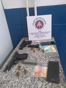 Por volta de 12h30 de domingo, 28, durante abordagem efetuada por uma guarnição da CETO em um quiosque no Povoado de Tanquinho, município de Senhor do Bonfim, foram apreendidas 02 (duas) pistolas calibre .380, sendo uma municiada com 17 (dezessete) cartuchos e a outra municiada com 15 (quinze) cartuchos, em posse de dois indivíduos, além de uma “peteca” de pó branco semelhante a cocaína, 02 (dois) celulares e a quantia de R$ 648,00. Sendo assim, os dois indivíduos, juntamente com o material apreendido, foram apresentados na delegacia para adoção das medidas pertinentes.