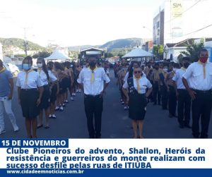 Aconteceu no último sábado, 13 de novembro de 2021, um grande desfile cívico pelas principais ruas da cidade de Itiúba. Clube Pioneiros do advento, Shallon, Heróis da resistência e guerreiros do monte, reuniram – se no mesmo propósito.