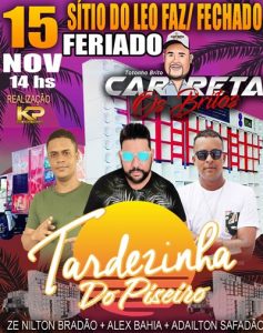 A Tardezinha do Piseiro será realizada no Sitio do Léo, na Fazenda Fechado e contará com a carreta Os Britos e shows com Zenilton Brandão, Alex Bahia e Adailton Safadão.