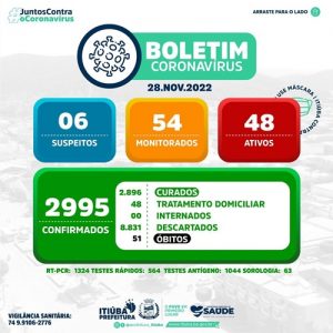 A Prefeitura de Itiúba divulgou noite desta segunda feira , 28 de novembro, o boletim epidemiológico do município. Os números continuam subindo e chegando a 48 casos ativos, de Covid – 19.