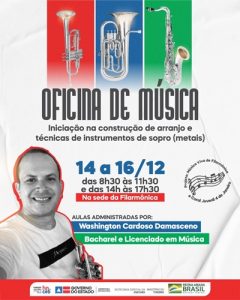 Acontecerá a partir desta segunda – feira, 14 de novembro, na Sede da Filarmônica, uma Oficina de Música GRATUITA, Ministrada pelo Músico Washington Cardoso.