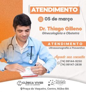 O Dr Thiago Gilleno, estará atendendo na Clínica Viver em Itiúba, nesta sexta – feira, 05 de março de 2021.