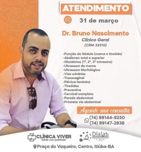 O Dr Bruno Nascimento, Clínico Geral, estará atendendo na Clínica Viver em Itiúba, nesta quarta – feira, 31 de março de 2021.