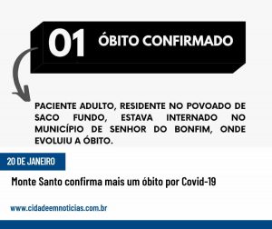A Prefeitura de Monte Santo divulgou na noite desta terça – feira, 20 de janeiro de 2021, o Boletim Epidemiológico que confirmou mais um óbito por COVID-19.
