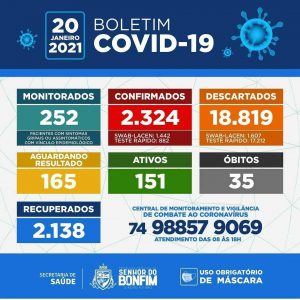 A Prefeitura de Senhor do Bonfim divulgou na noite desta quarta – feira, 20 de janeiro de 2021, o Boletim Epidemiológico que confirmou mais um óbito por COVID-19.