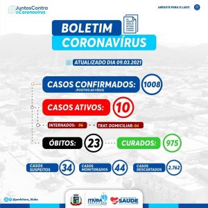 A Prefeitura de Itiúba, divulgou na noite desta terça – feira, 09 de março de 2021, mais um boletim epidemiológico do município.