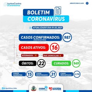 A Prefeitura de Itiúba, divulgou na noite desta segunda – feira, 1 de março de 2021, mais um boletim epidemiológico do município. Segundo as informações divulgadas, o município conta com 16 casos ativos de Coronavírus no Município.