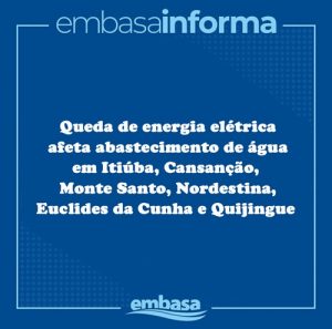 A Embasa informa que uma queda de energia elétrica afetou os sistemas de abastecimento de água de Rômulo Campos e Tucano Sul desde a tarde de ontem (08), prejudicando o fornecimento de água nos municípios de Itiúba, Cansanção, Monte Santo, Nordestina, Euclides da Cunha e Quijingue.