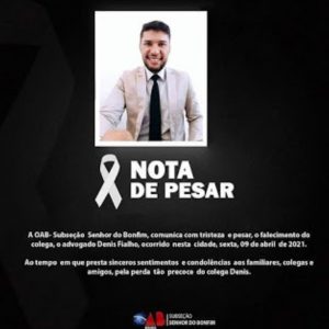 Faleceu nesta sexta-feira (09) o jovem advogado Denis Fialho. A morte foi confirmada pela Ordem dos Advogados do Brasil (OAB), subseção Senhor do Bonfim, através de nota.